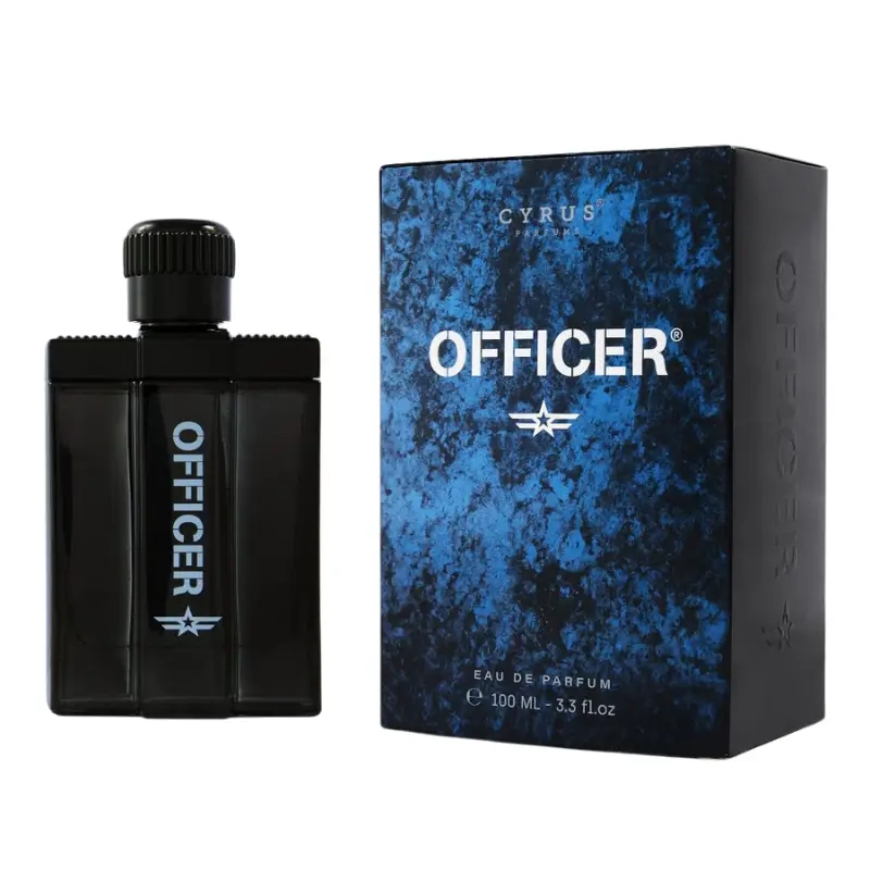 Officer est un parfum masculin puissant et raffiné, idéal pour les hommes ambitieux. Il s’ouvre sur la vivacité de la bergamote et du citron, relevée par le poivre rose, le chocolat et des touches fruitées. Le cœur dévoile un mélange aromatique de lavande, cardamome, jasmin, ananas et lys. Le fond, boisé et sensuel, composé de bois, d’ambre, de fève tonka, de mousse et de musc, laisse un sillage inoubliable.