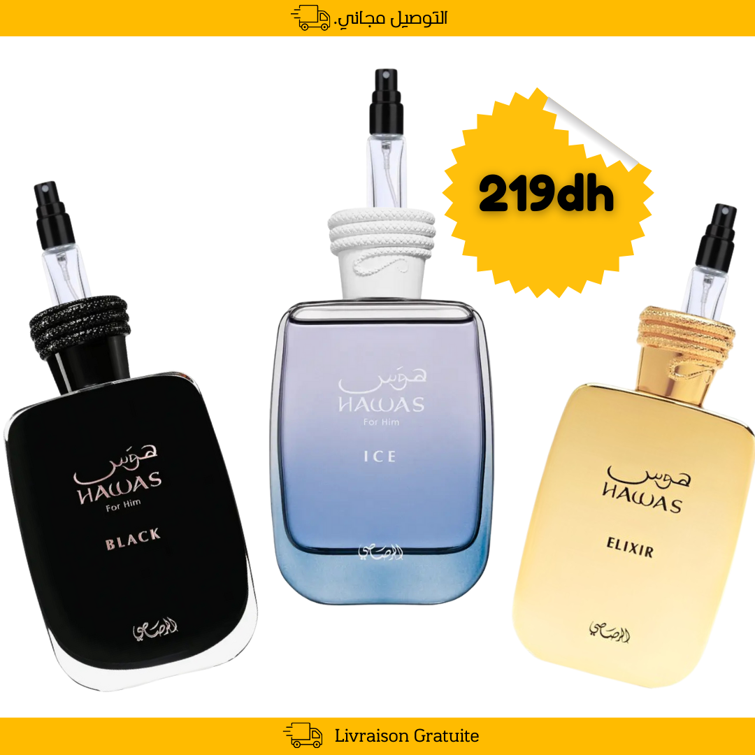 Découvrez notre pack exclusif combinant trois fragrances incontournables : Hawas, Black Elixir et Ice, chacune proposée en format décanté de 10 ml.